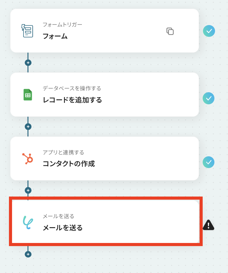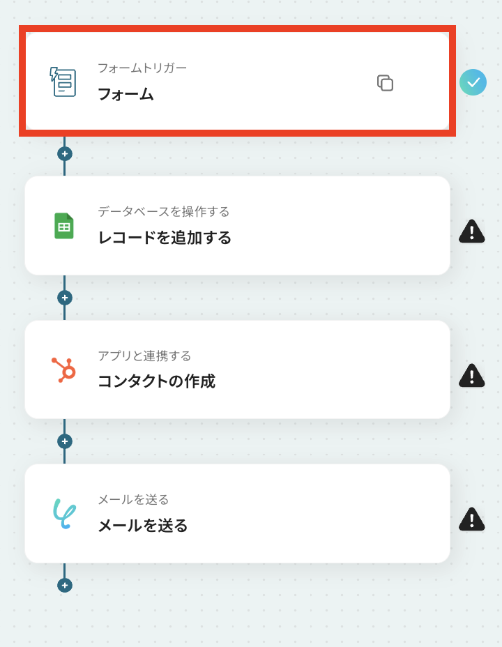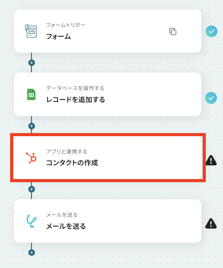 - フォームのトリガー設定とHubSpotのアクション設定(コンタクト登録など)
