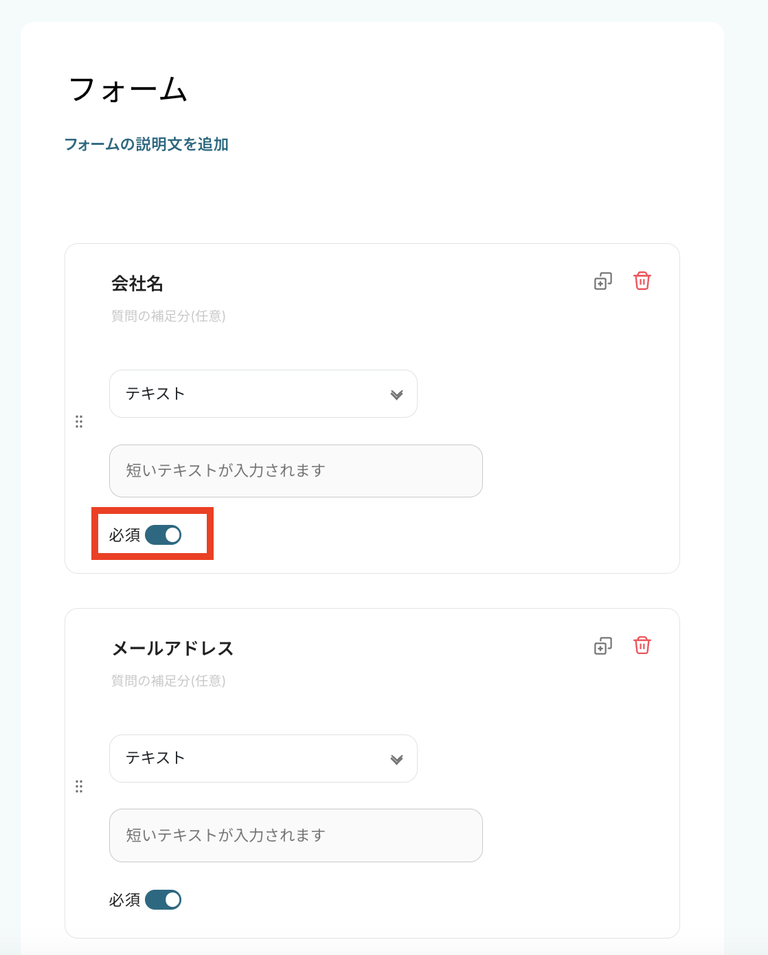 タイトルや回答を必須にするかどうかの設定を行うことができます。