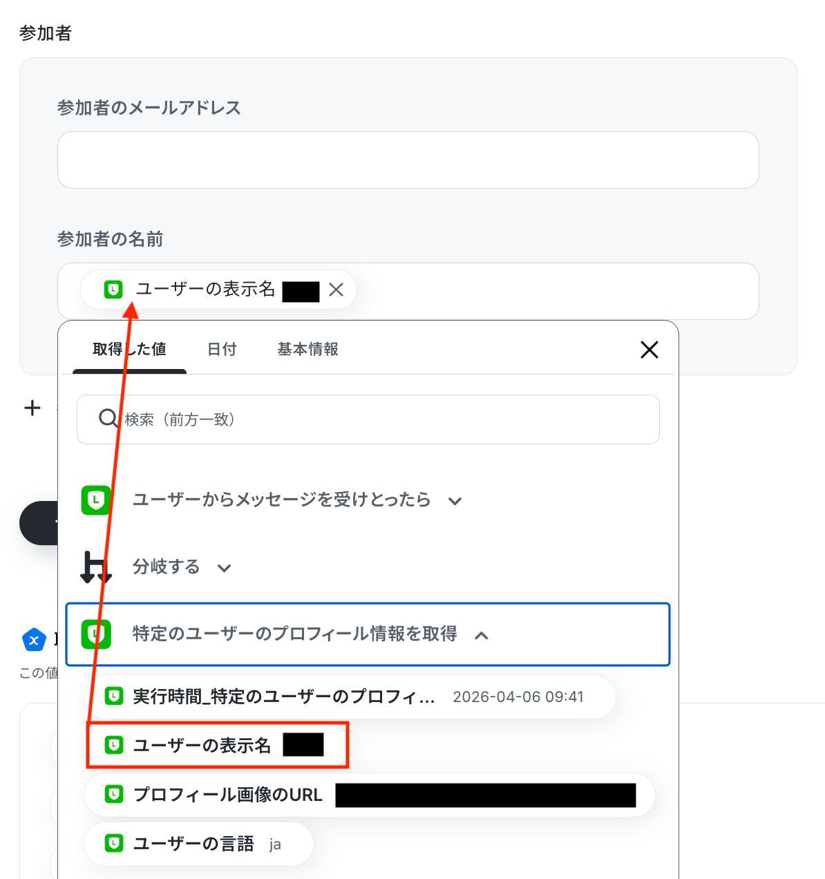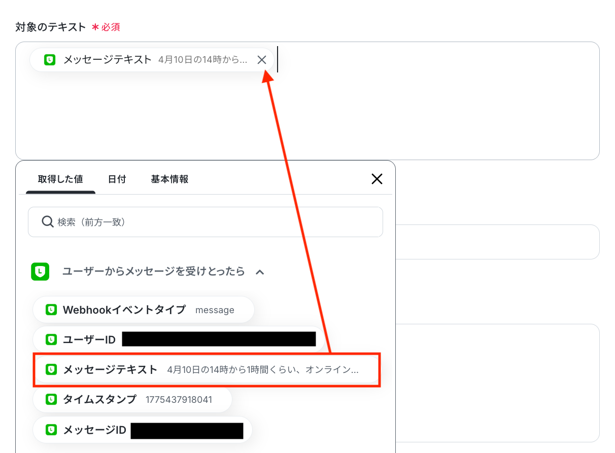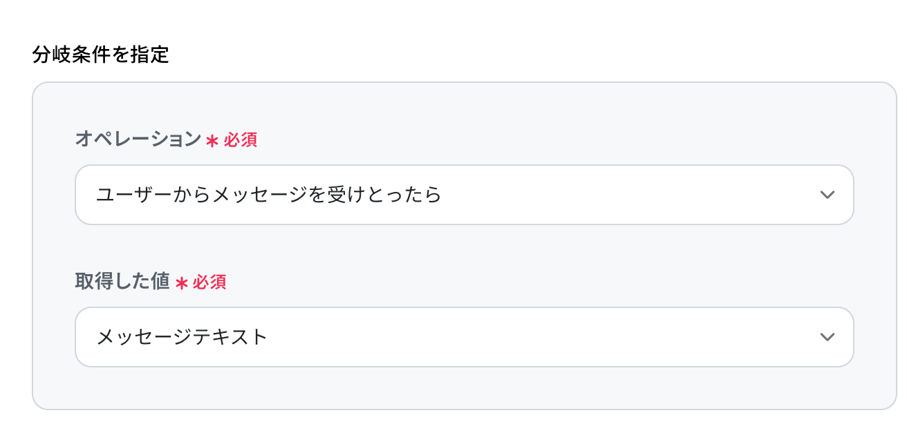 続いて、トリガーのステップでLINE公式アカウントから取得した値を利用して、分岐条件の設定を行いましょう。