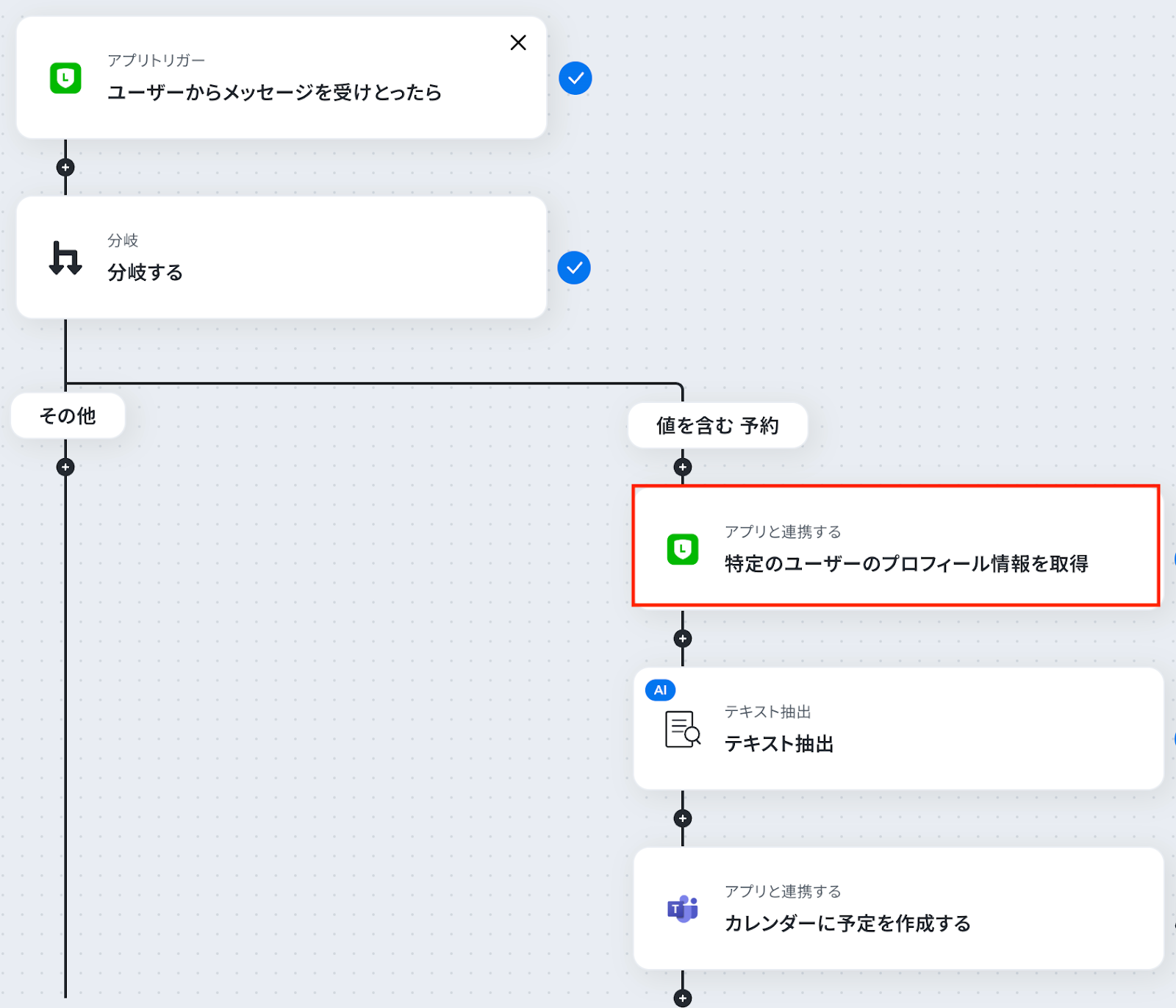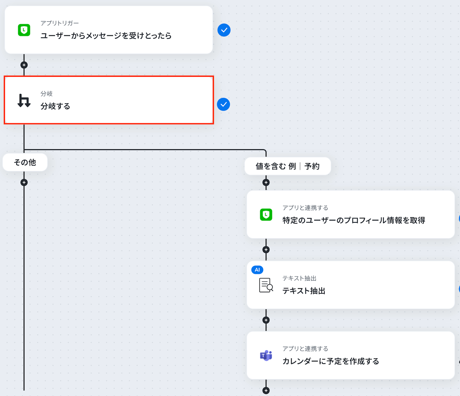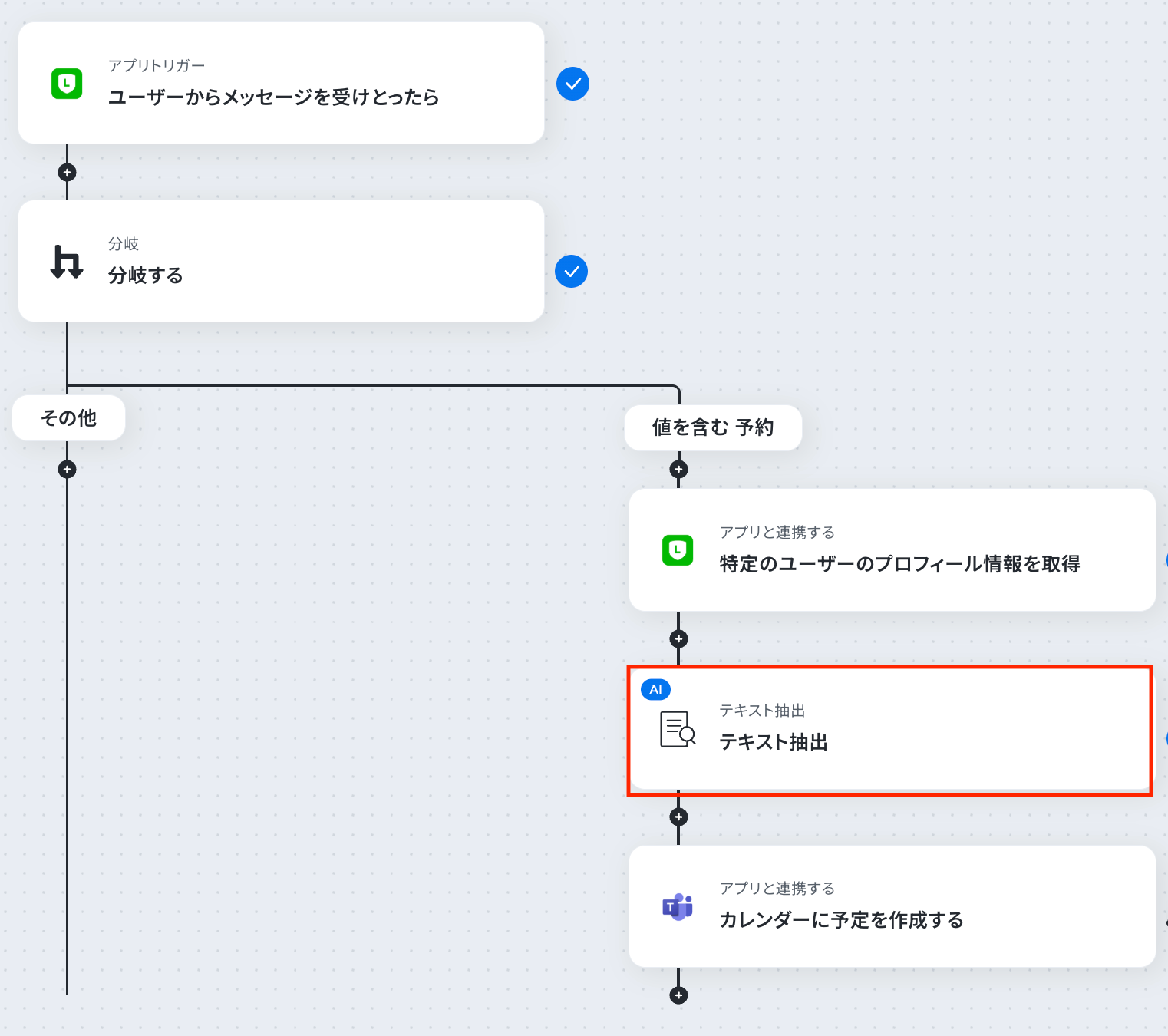 この設定により、LINE公式アカウントから取得したメッセージに「予約」というキーワードが含まれている場合のみ、後続の処理が実行されるようになります。