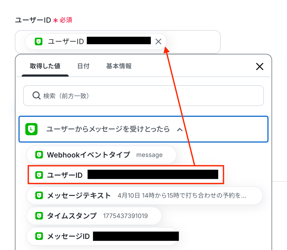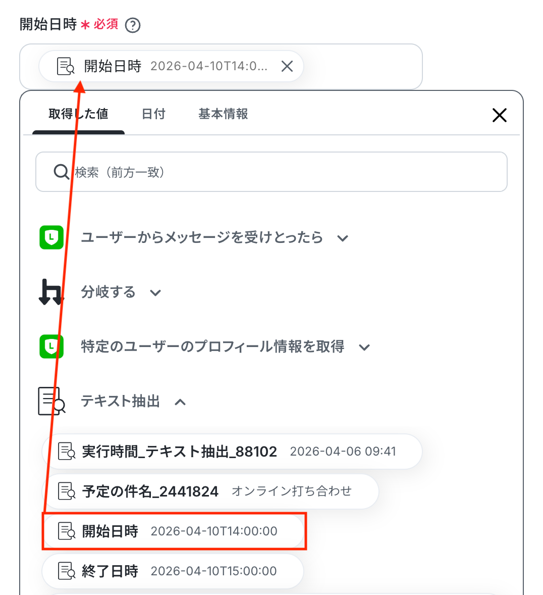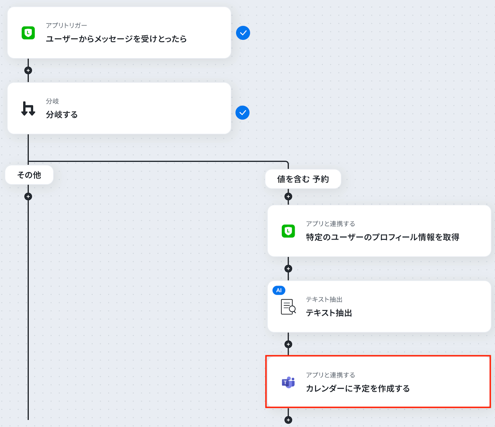 この設定により、LINE公式アカウントから取得したメッセージに「予約」というキーワードが含まれている場合のみ、後続の処理が実行されるようになります。