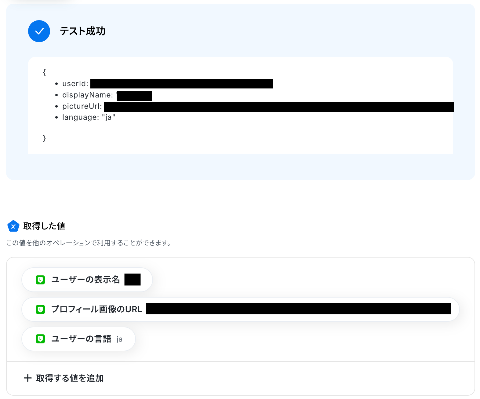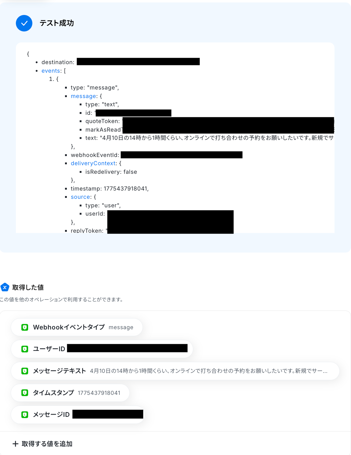 テストに成功すると、LINE公式アカウントで受信したメッセージに関する情報が一覧で表示されます。