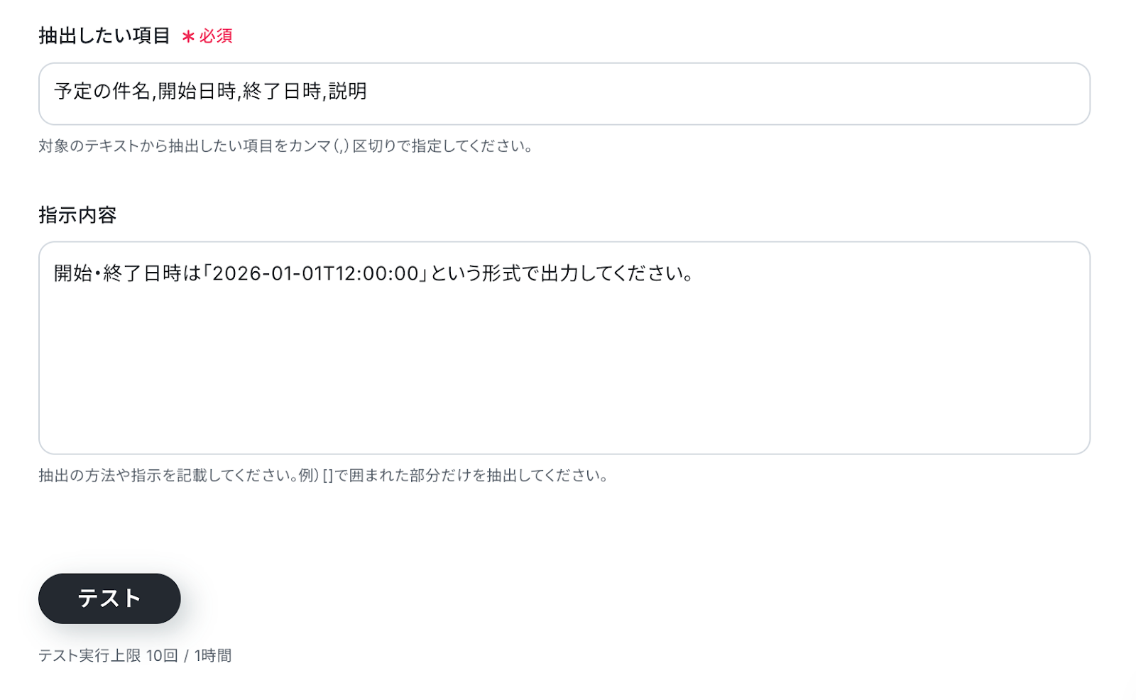 - AI機能に与える指示内容は、メッセージから抽出したい項目(例:氏名、希望日時、内容)や日時のフォーマットなどを任意で設定できます。