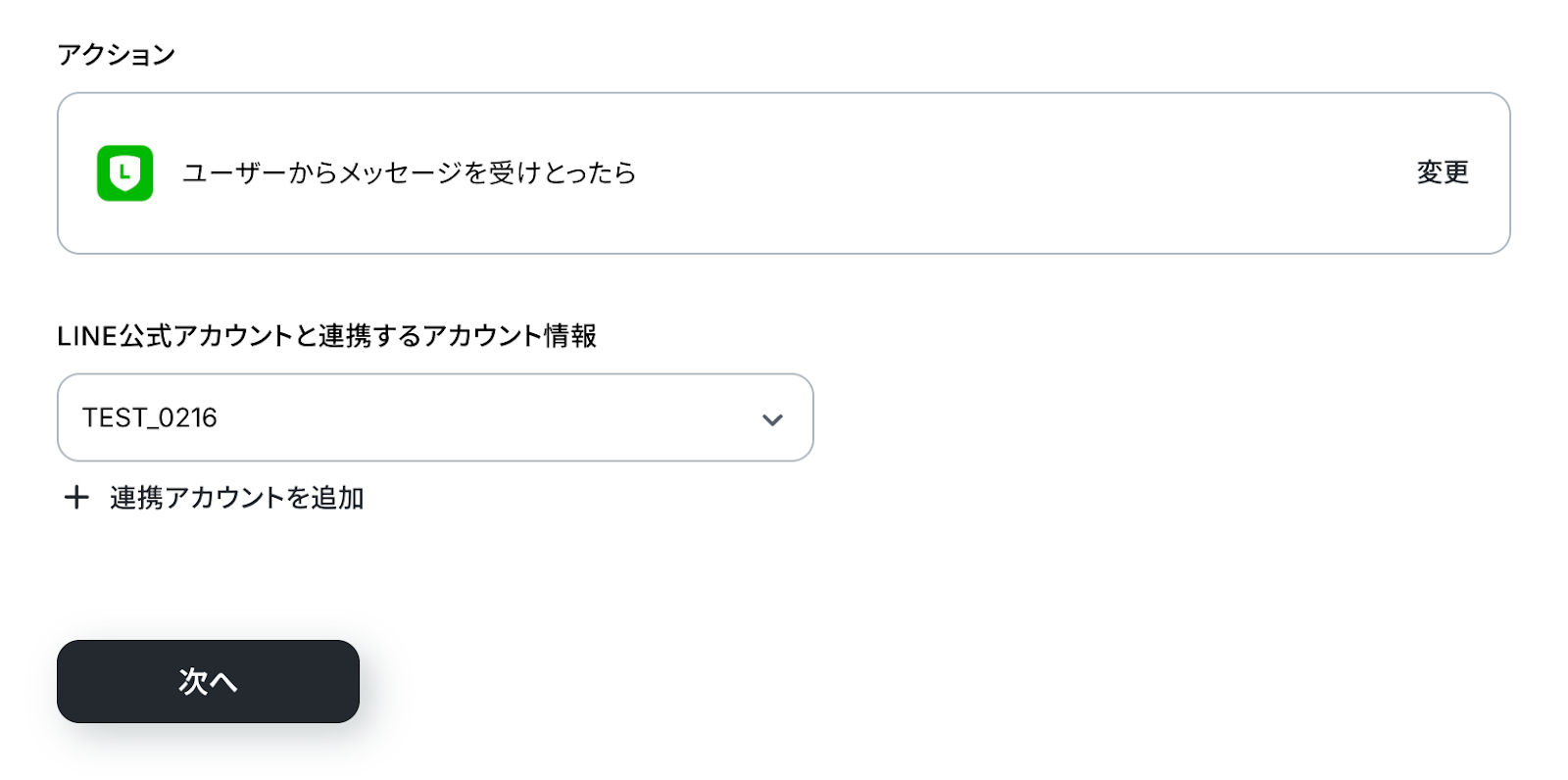 - 次に、トリガーでLINE公式アカウントを選択し、「ユーザーからメッセージを受けとったら」というアクションを設定します。