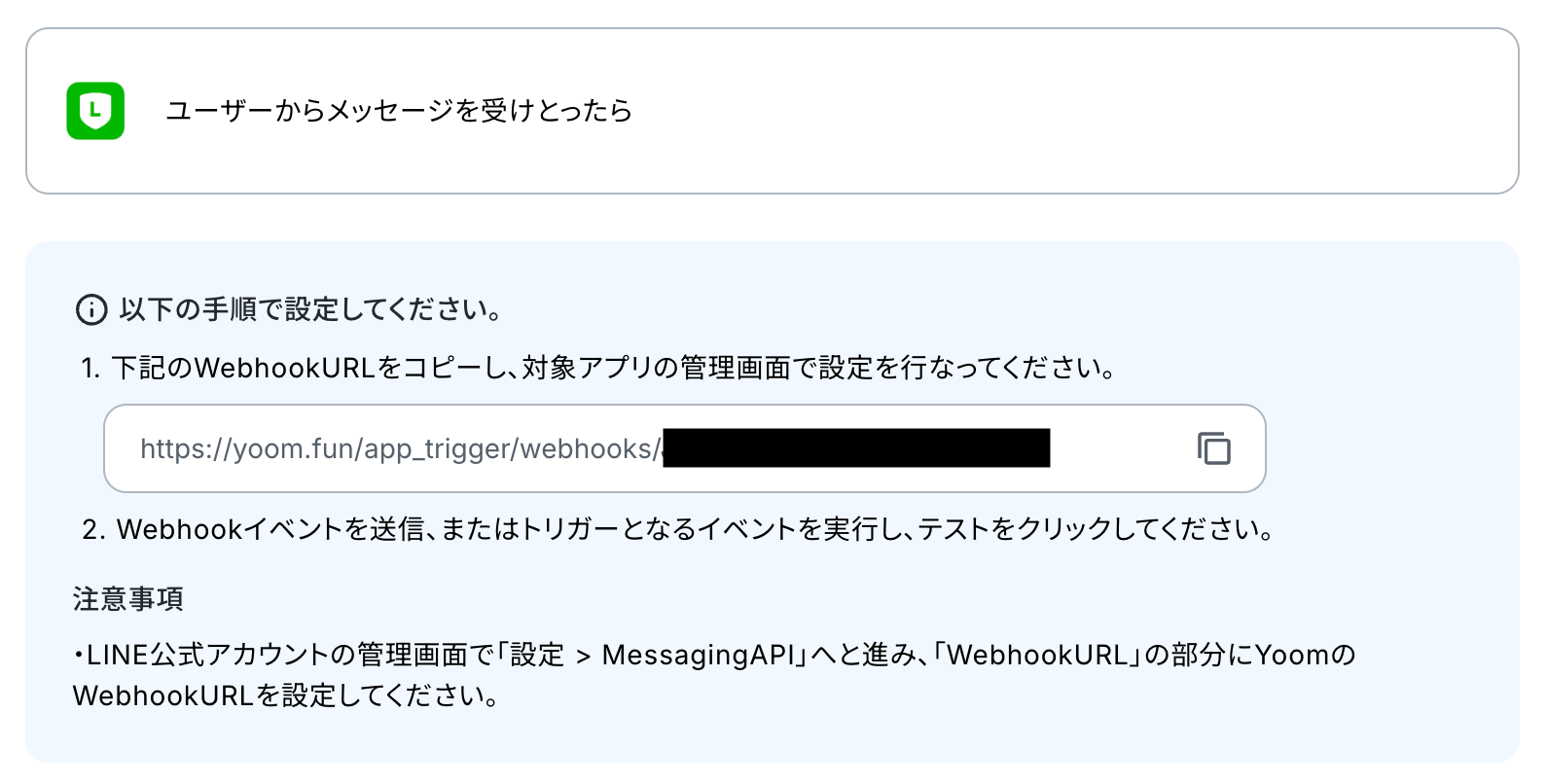 この設定により、メッセージの受信などのイベントが発生した際に、その内容がWebhook経由で自動的に通知され、Yoom側で処理を開始できるようになります。