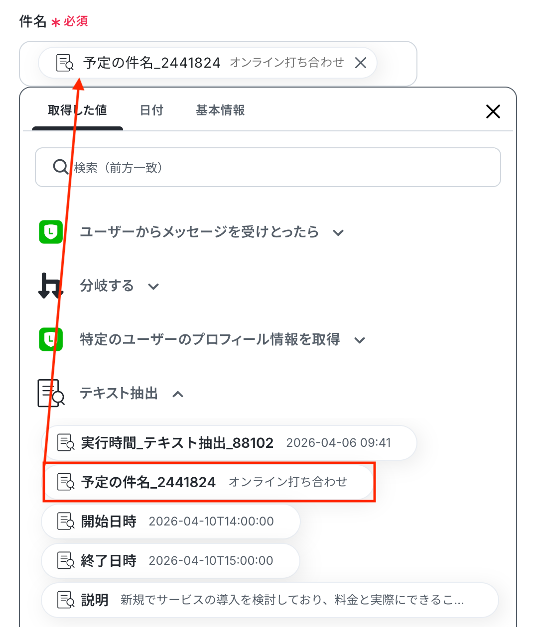- 次に、オペレーションでAI機能を活用し、メッセージ本文から日時や件名などの情報を抽出します。