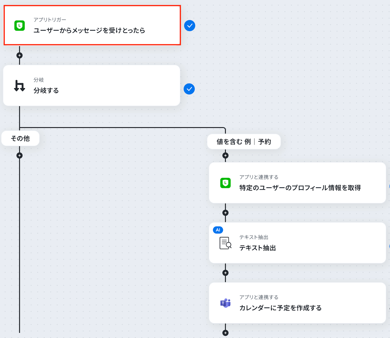 ここで受信したメッセージがトリガーイベントとなり、自動化の起点となります。