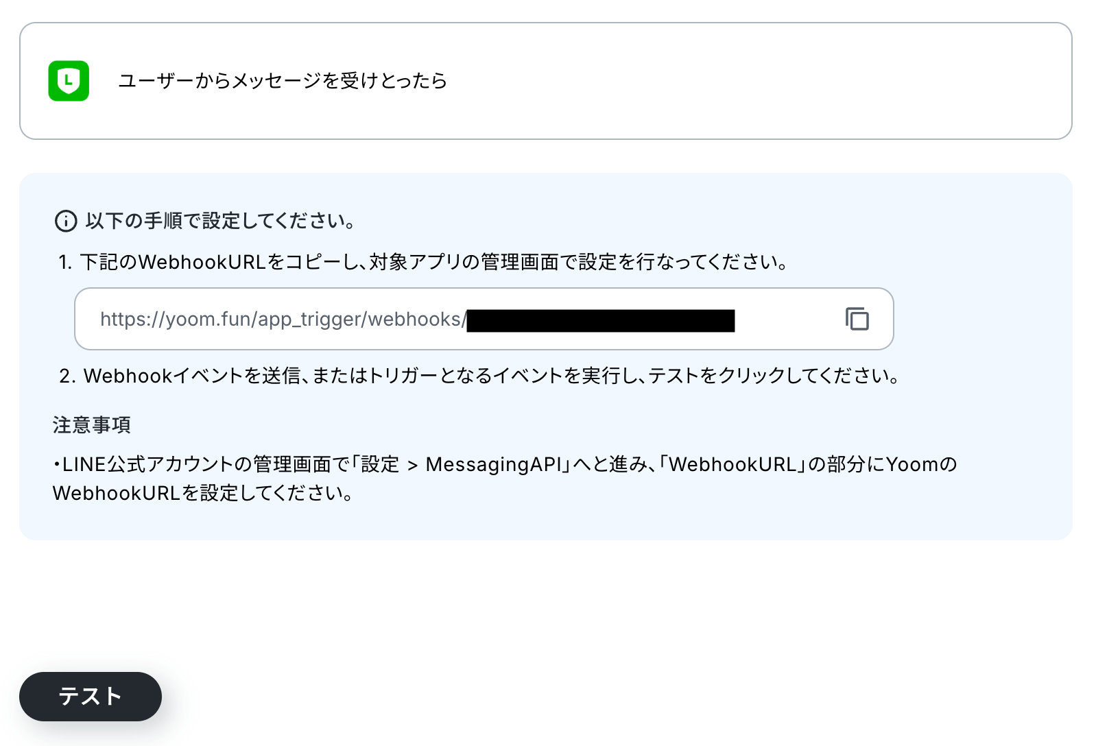 メッセージの受信が完了したら、設定内容とトリガーの動作を確認するため「テスト」をクリックしましょう。