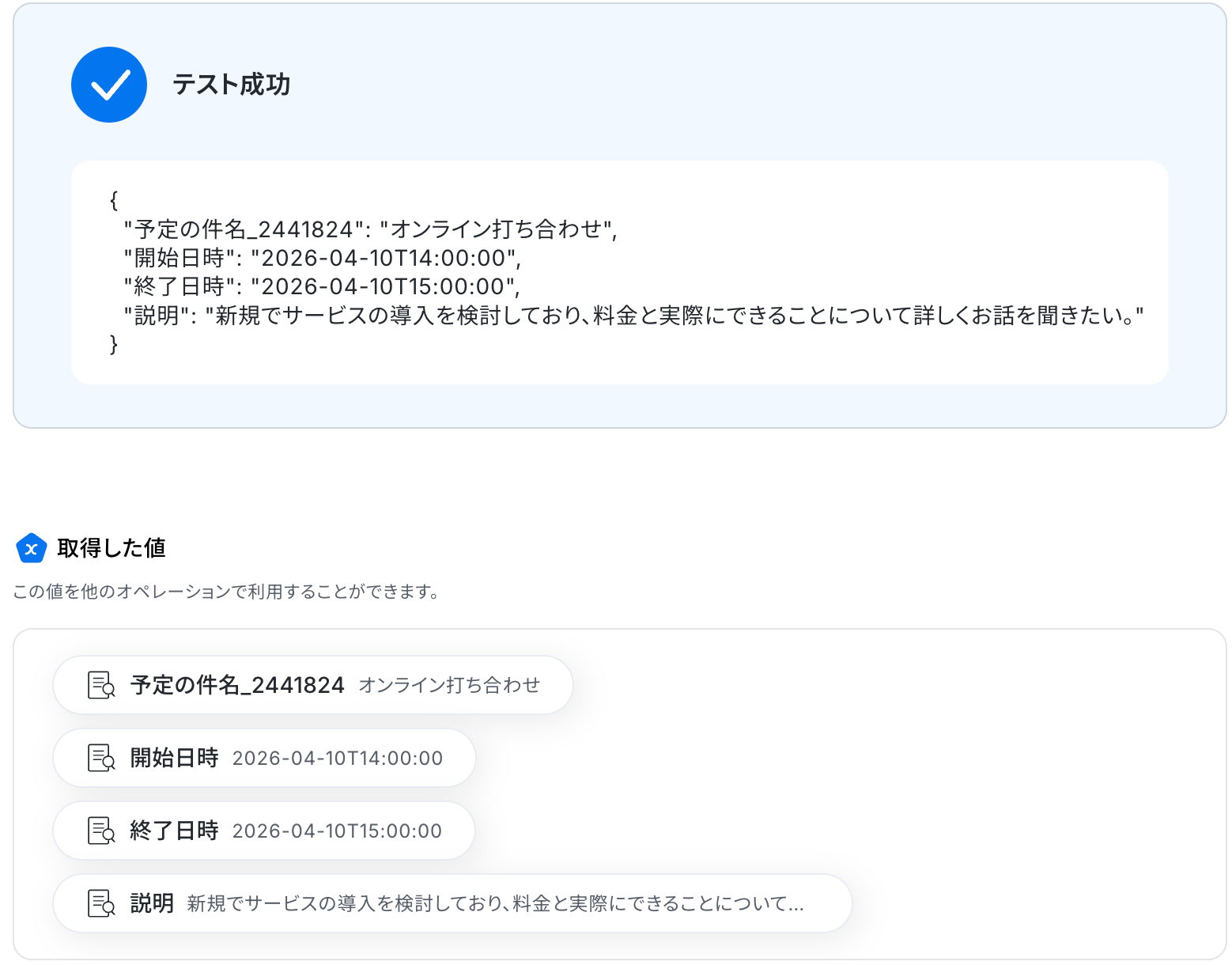 トリガーやオペレーション設定時に、「テスト」を実行して取得した値のことを指します。