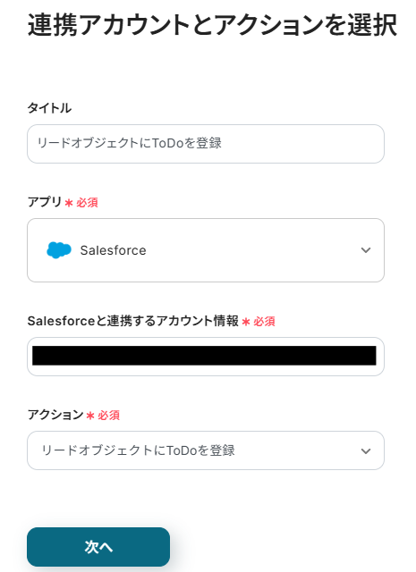 先ほどと同様にタイトルと連携するアカウント情報を任意で設定し、アクションはテンプレート通りに「リードオブジェクトにToDoを登録」のまま「次へ」をクリックして進んでください。