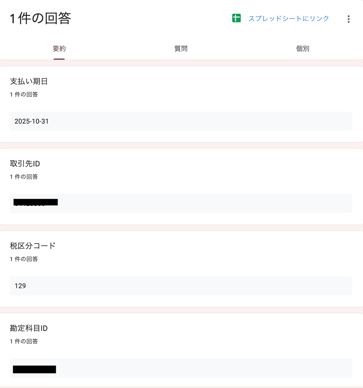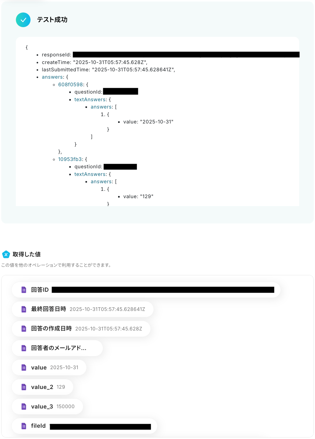 テストに成功すると、Googleフォームに送信された回答に関する情報が一覧で表示されます。
