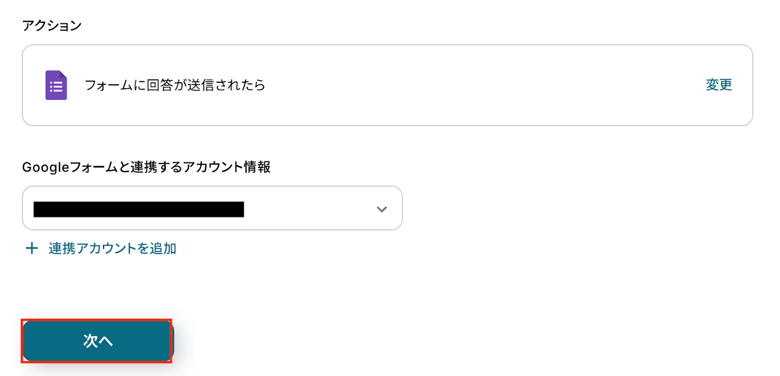 Googleフォームと連携するアカウント情報に問題がなければ、「次へ」をクリックします。