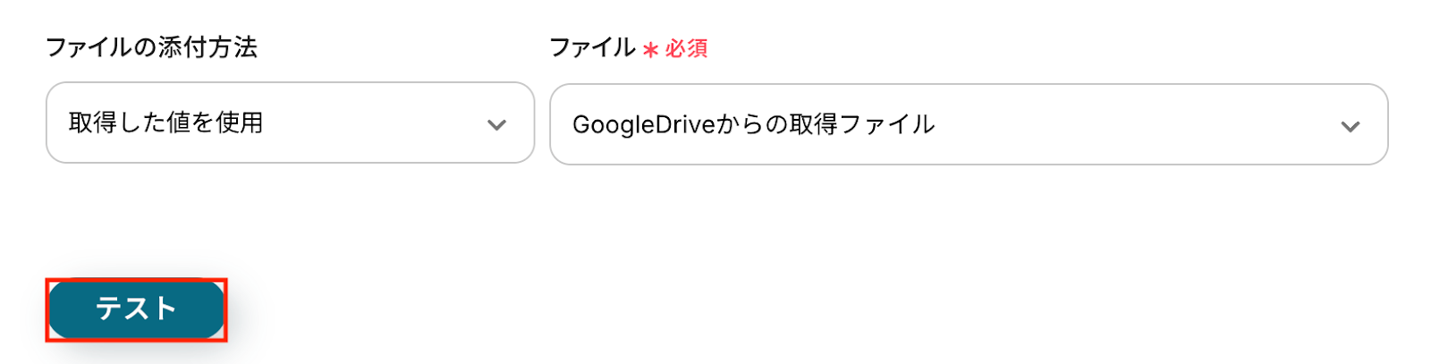 入力が完了したら「テスト」をクリックし、Googleフォームの回答内容が正しく取得できるか確認しましょう。