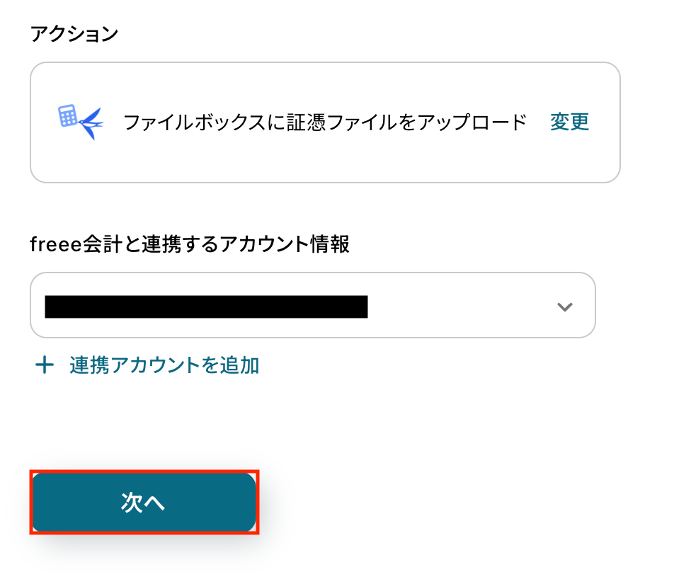 - 最後に、オペレーションでfreee会計の「ファイルボックスに証憑ファイルをアップロード」アクションを設定します。