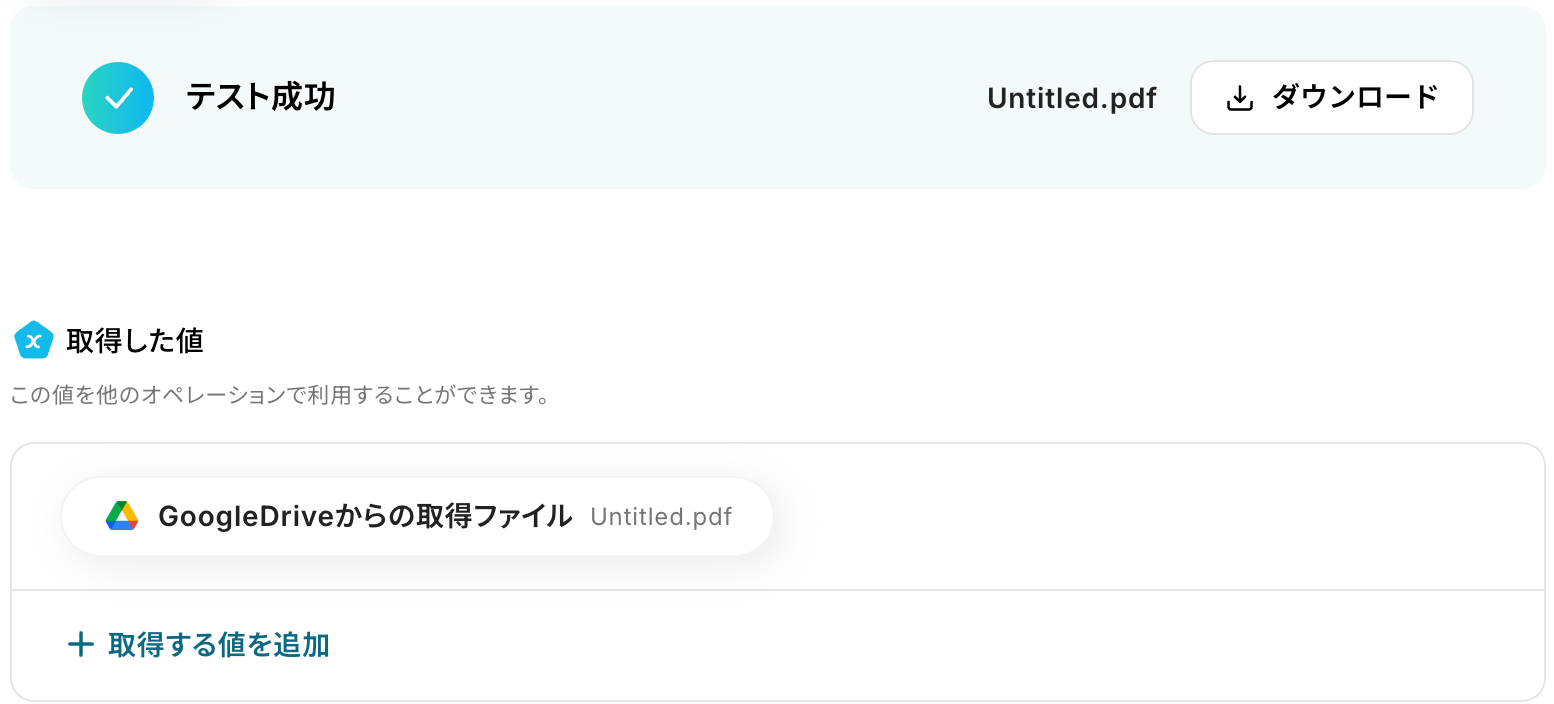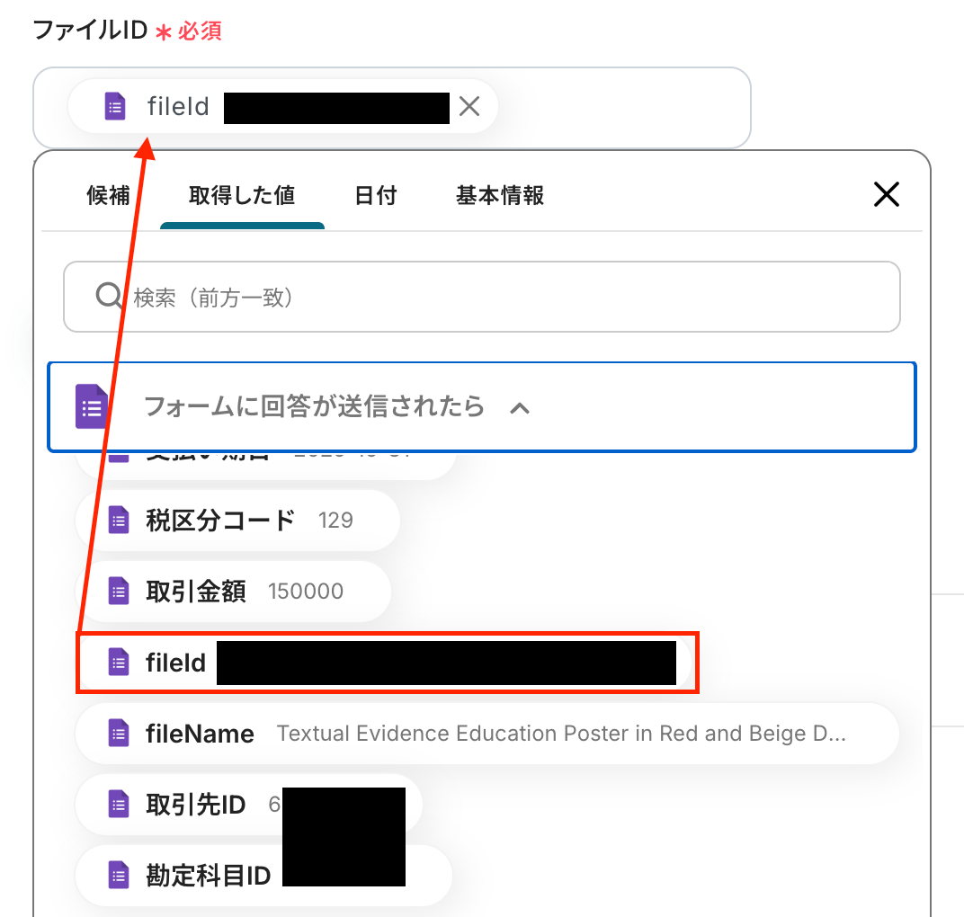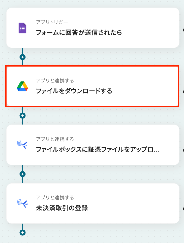 続いて、前のステップでGoogleフォームから取得した値を利用して、証憑ファイルをダウンロードする設定を行いましょう。