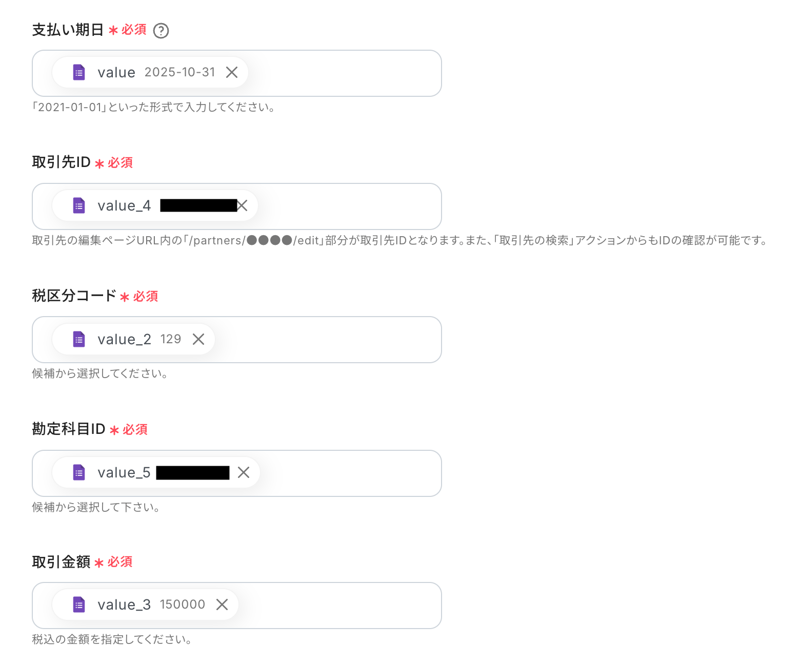 - freee会計への経費申請を作成する際、OCR機能で取得した情報の他に、勘定科目などを固定値として設定したり、申請内容を動的に割り当てたりすることが可能です。