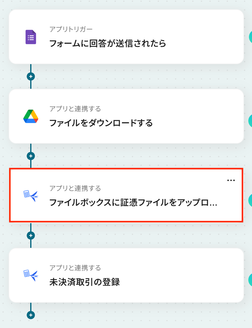 たとえば、メールツールをトリガーに設定し、受信した添付ファイルをダウンロードしてファイルボックスへアップロードし、そのまま未決済取引を登録する、といった一連の流れを実行できます。