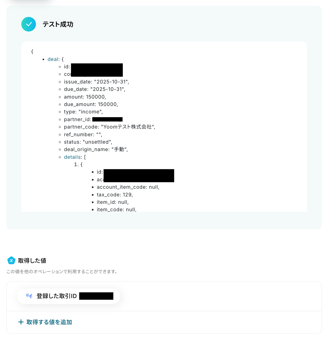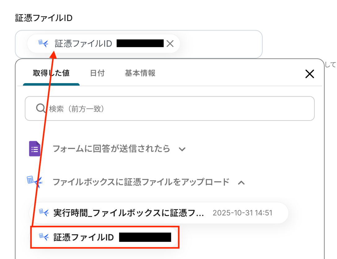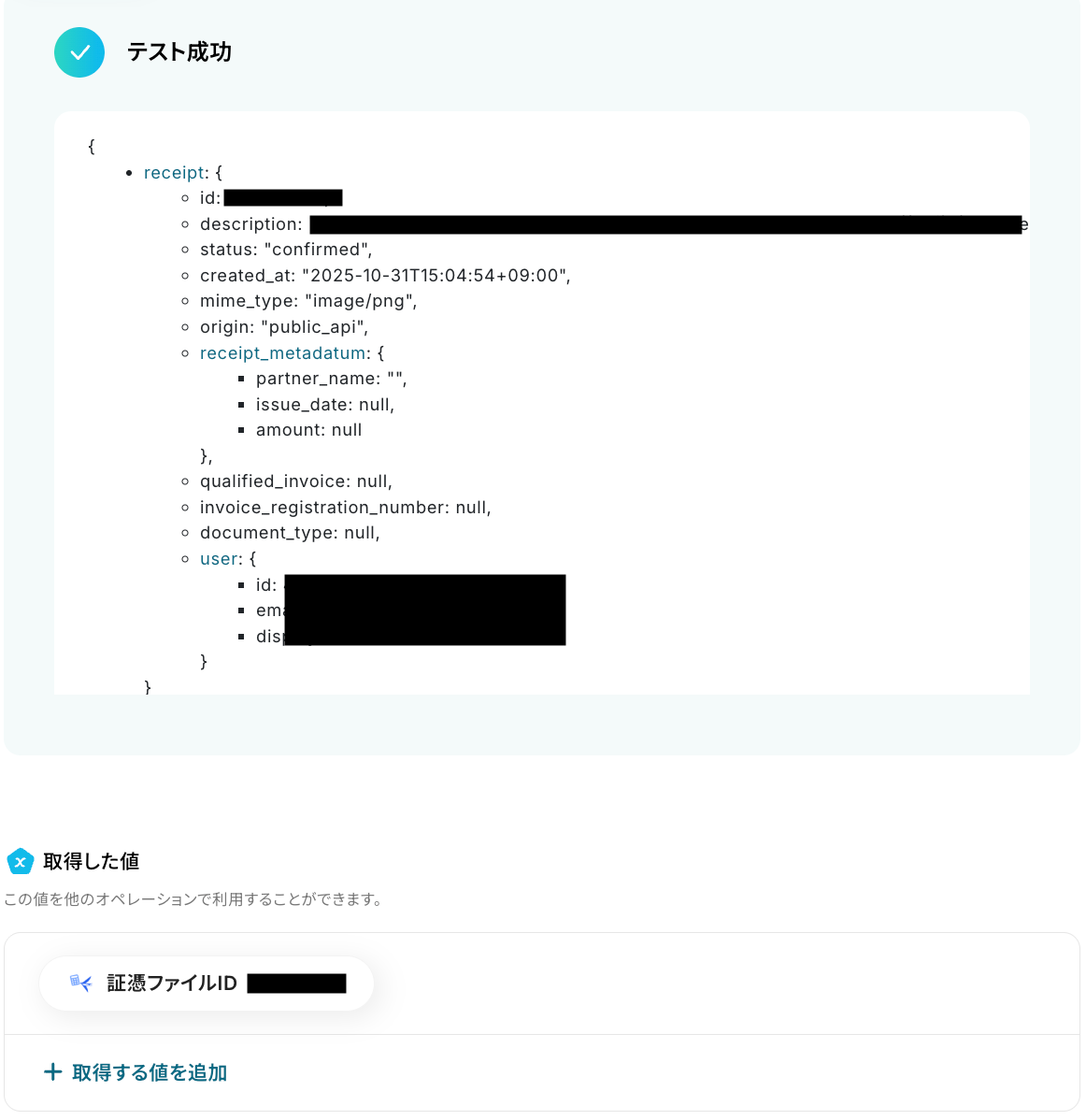 以下の画像の取得した値を利用して、この後のステップでfreee会計のファイルボックスへ証憑ファイルをアップロードすることができます。