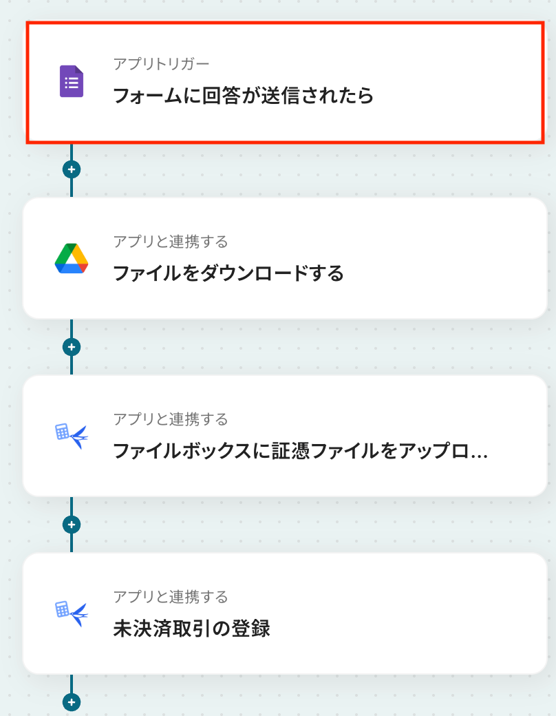 それではここから代表的な例として、Googleフォームで証憑ファイルがアップロードされた際に、そのファイルをfreee会計に自動で登録するフローを解説していきます!