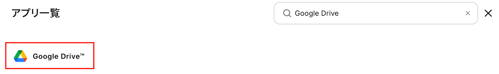 新規接続をクリックしたあと、アプリのメニュー一覧が表示されるのでGoogle Driveと検索し対象アプリをクリックしてください。