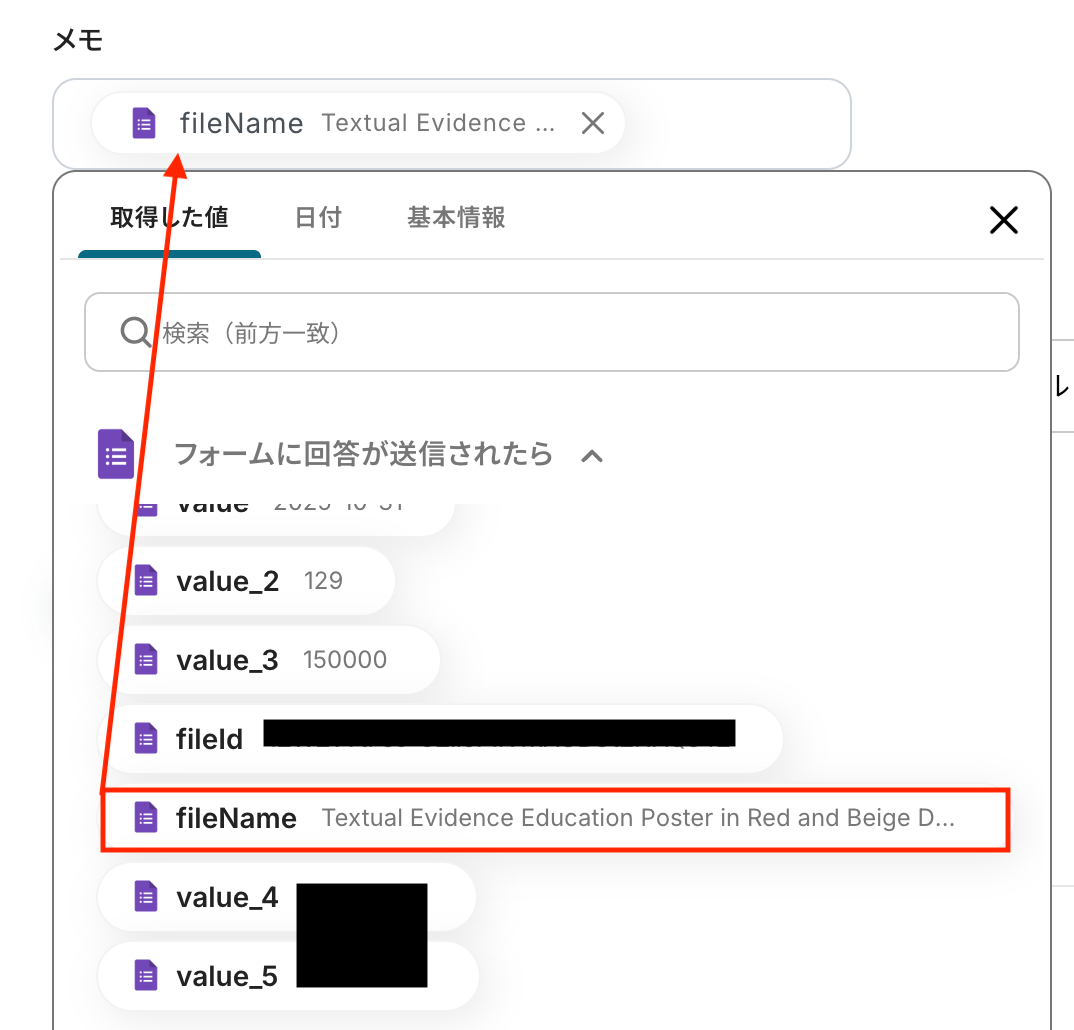 入力欄をクリックすると、前のステップでGoogleフォームから取得した値が表示されるので、選択して入力しましょう。