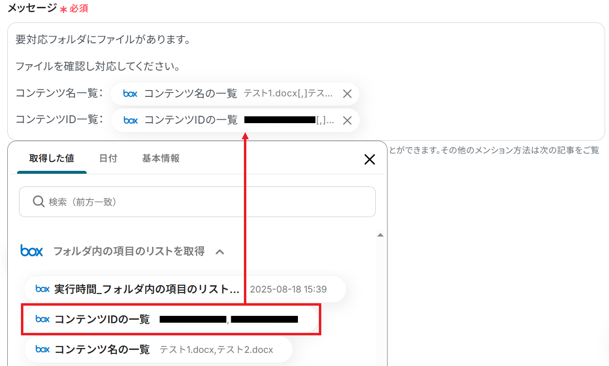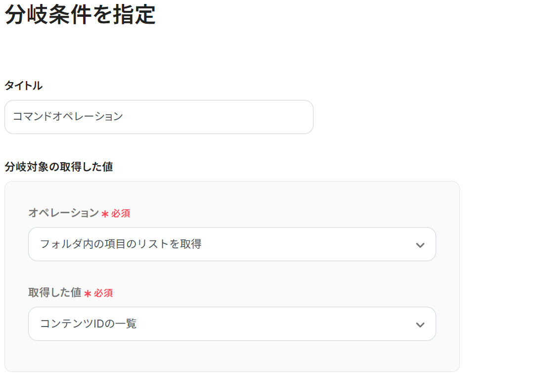 オペレーションは「フォルダ内の項目のリストを取得」、取得した値は「コンテンツIDの一覧」のままで大丈夫です。
