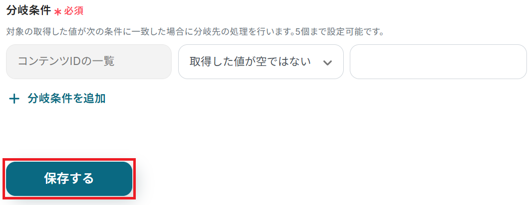 次に分岐条件を設定しましょう。今回は、取得した値(コンテンツIDの一覧)が空ではない場合に次のステップに進むよう設定しています。