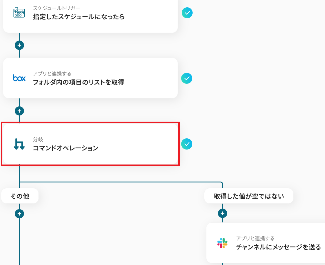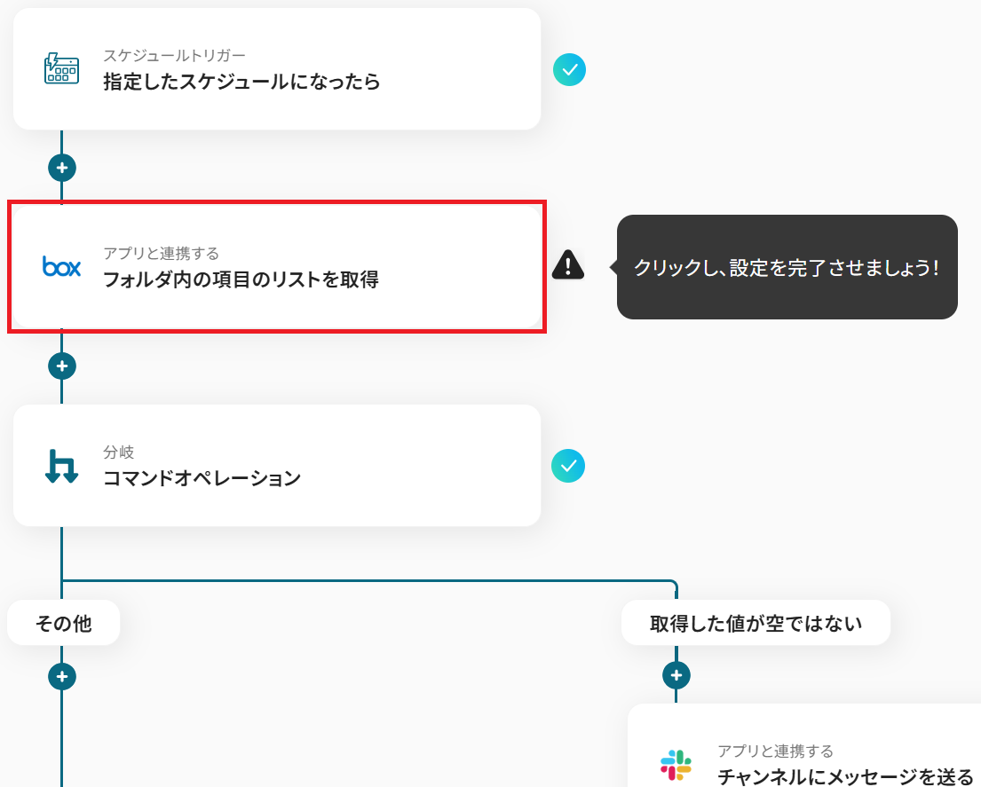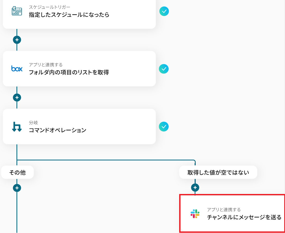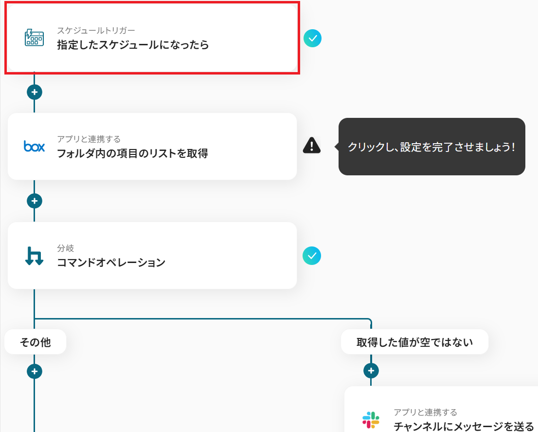 - スケジュールトリガーの設定、Boxのアクション設定、分岐設定、Slackのアクション設定