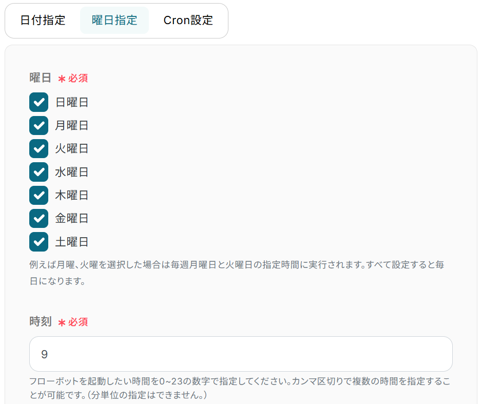 2) 曜日指定…フローボットを起動したい曜日にチェックを入れ、時刻を入力
