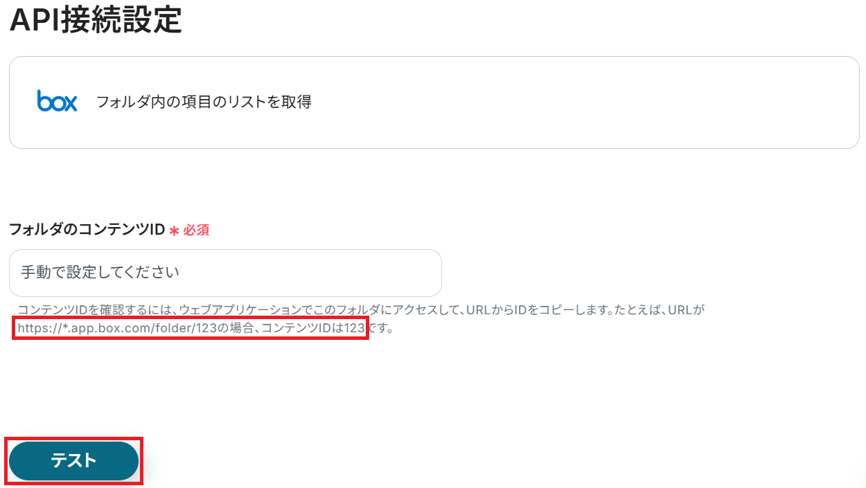 テキストボックス下部の説明通りにフォルダのコンテンツIDを入力して、テストしてください。