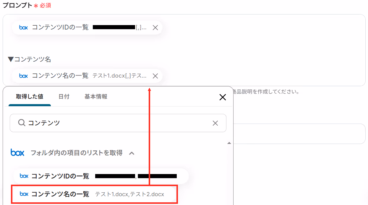 入力欄をクリックすると、以下のように先ほど取得したBoxの情報を引用できます。