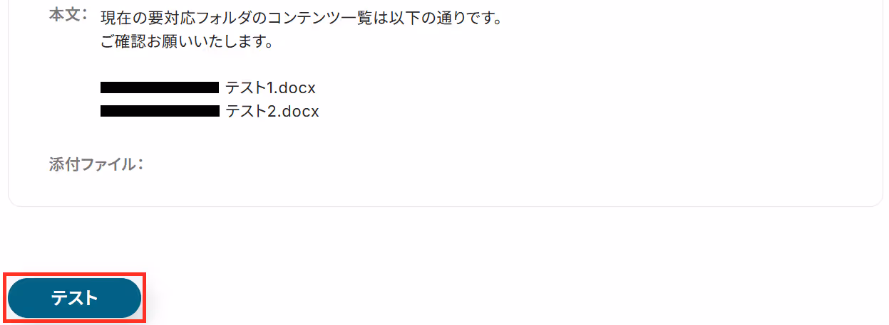 「テスト」をクリックすると実際にメールが送信されます。送付されてもいいアドレスか事前にご確認いただくと安心です。