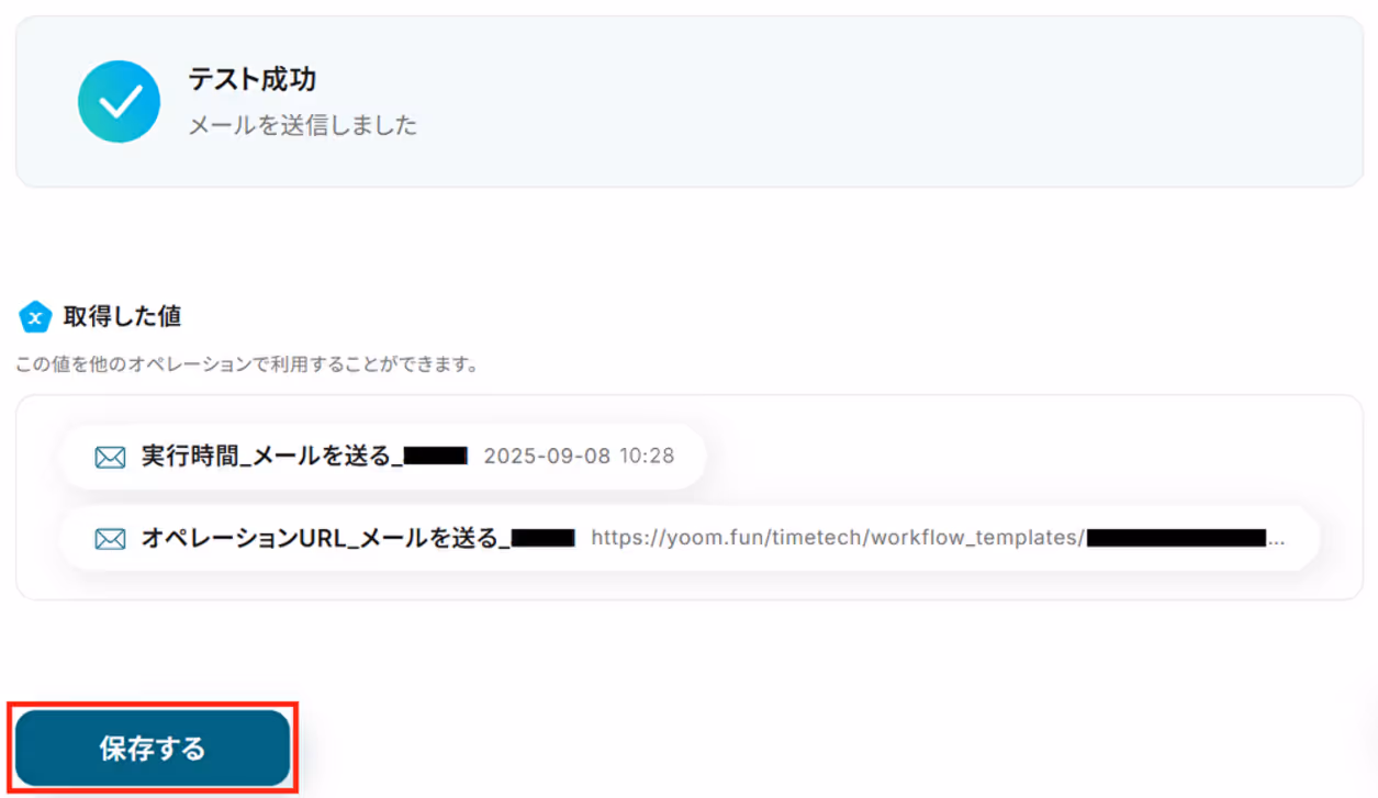 テストが成功すると、「テスト成功」という画面が表示され、Boxから取得した情報をYoomで引用できるようになります。