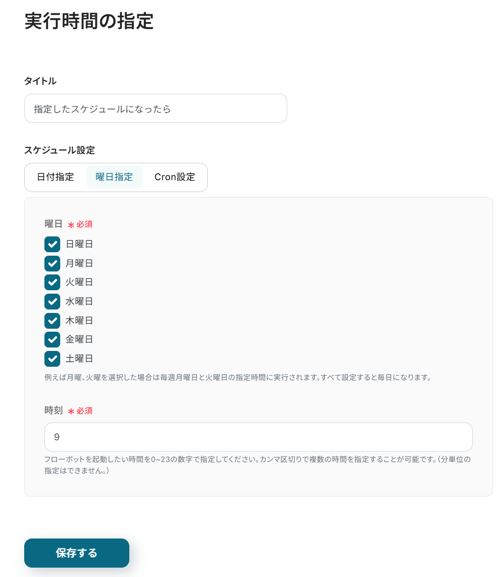 今回のフローボットは、既にすべての曜日でタスク期限が近づいたら通知するように設定されています。