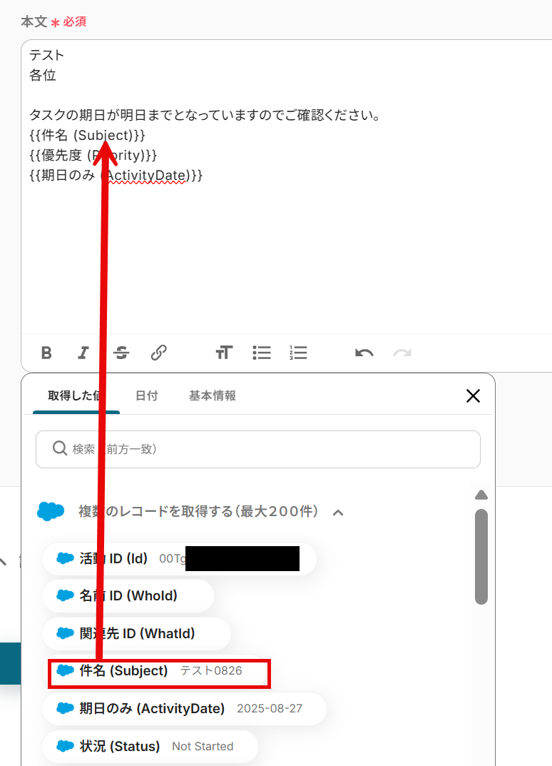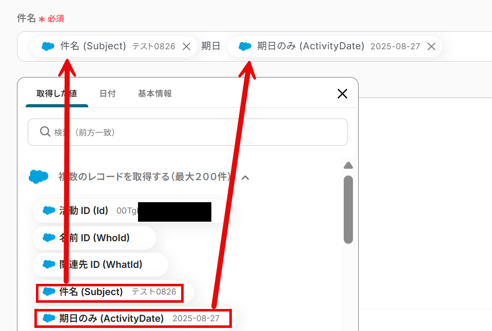 前項で取得した値から「件名」や「期日のみ」などを設定できます。