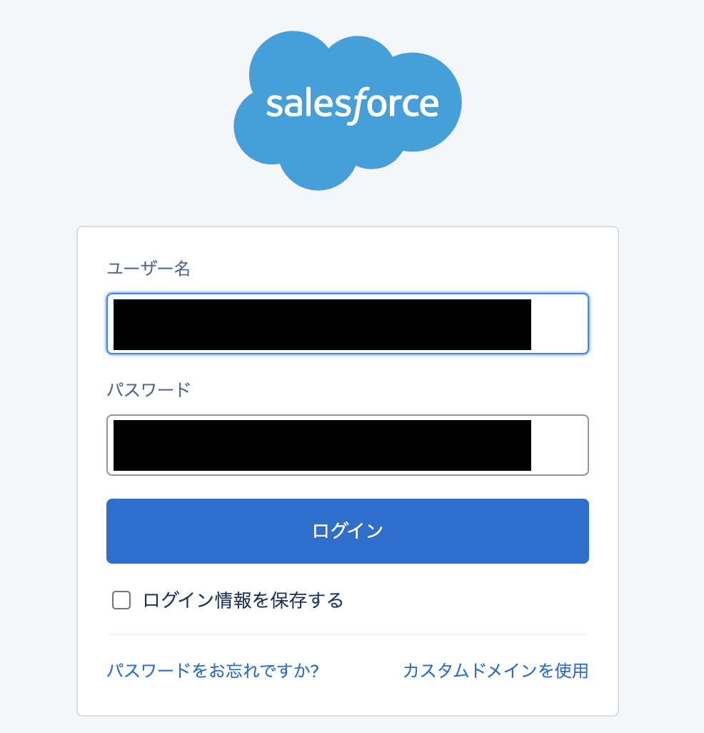 Salesforceのログイン画面に移行するので、「ユーザー名」、「パスワード」を入力しログインをクリックしましょう。