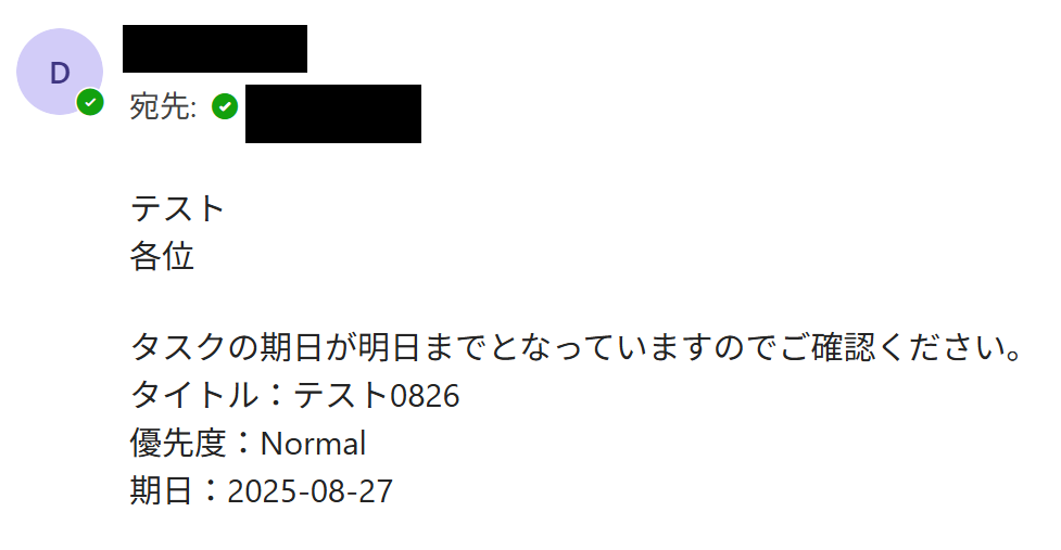 今回は以下のタスク期日が翌日のため、担当者へOutlookで通知する流れです。