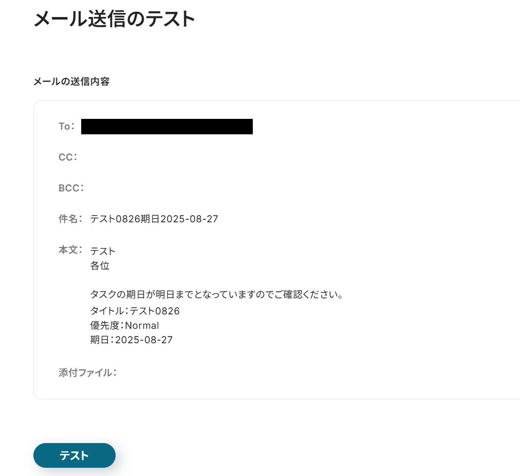 テストが成功すると以下のように表示され、Outlookにはメールが届くので確認します。