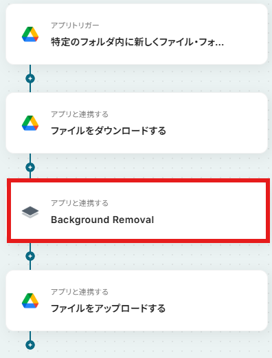 Google Driveのトリガー設定では、どのフォルダを監視対象にするかを任意で設定してください。 Remove.bgのアクション設定では、背景削除を行う際の画像サイズなどを任意で指定することが可能です。 背景削除後の画像をGoogle Driveにアップロードする際に、保存先のフォルダやファイル名を任意で設定できます。 ■注意事項