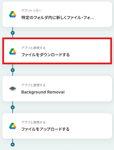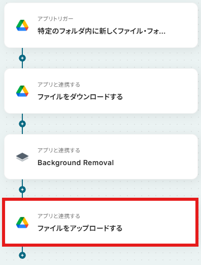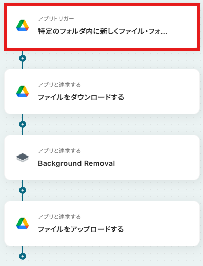 はじめに、Google DriveとRemove.bgをYoomと連携します。 次に、トリガーでGoogle Driveを選択し、「特定のフォルダ内に新しくファイル・フォルダが作成されたら」というアクションを設定します。 続いて、オペレーションでGoogle Driveの「ファイルをダウンロードする」アクションを設定し、トリガーで検知したファイルを指定します。 次に、オペレーションでRemove.bgの「Background Removal」アクションを設定し、ダウンロードしたファイルを処理します。 最後に、オペレーションでGoogle Driveの「ファイルをアップロードする」アクションを設定し、背景が削除された画像を任意のフォルダに保存します。 ※「トリガー」:フロー起動のきっかけとなるアクション、「オペレーション」:トリガー起動後、フロー内で処理を行うアクション■このワークフローのカスタムポイント
