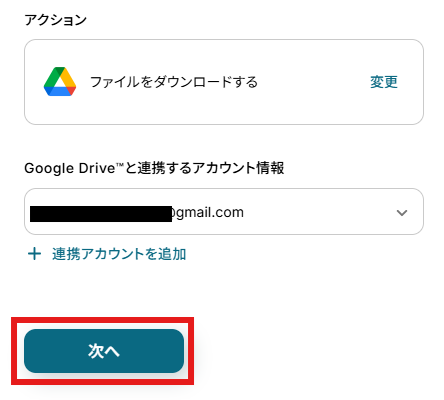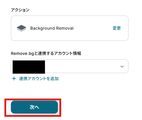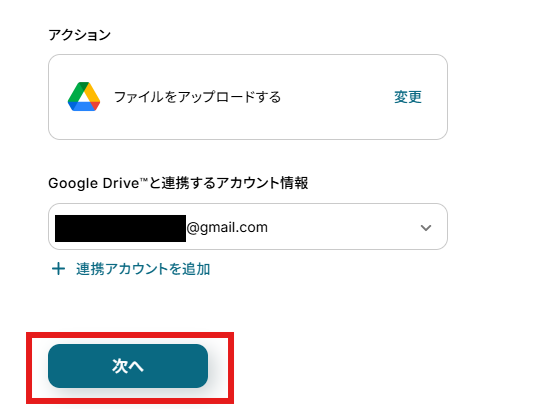アクションはデフォルト設定のまま、アカウント情報は、連携したいアカウントが選択されているか確認してください。確認が終わったら「次へ」で進みましょう。