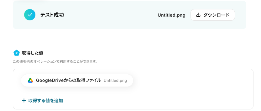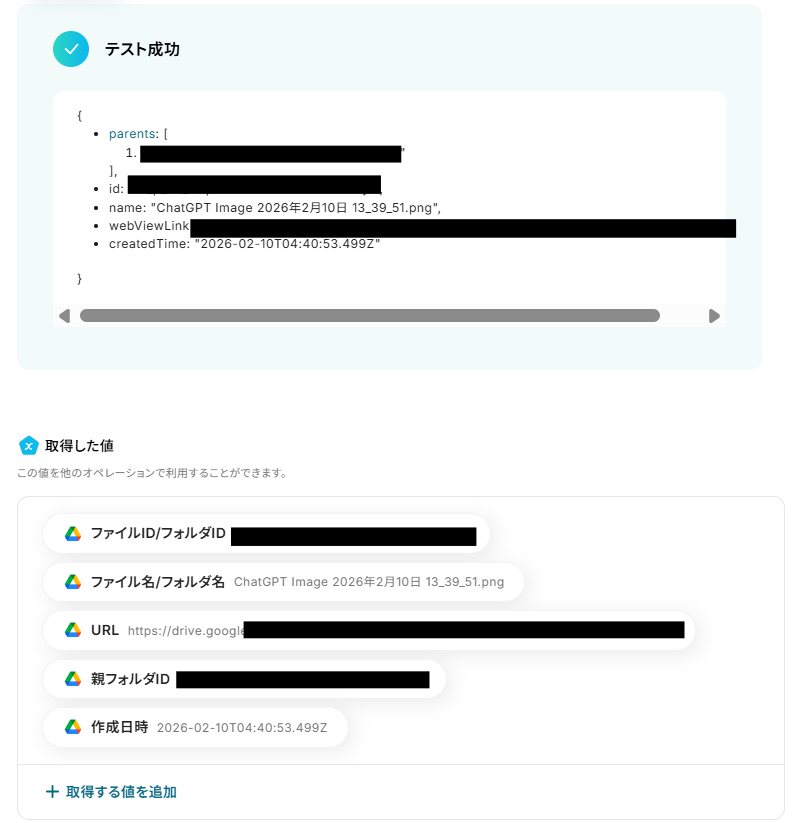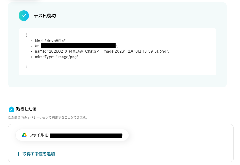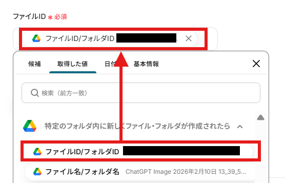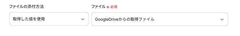 「ファイルID」はデフォルトで入力されています。デフォルト値を消してしまったなどで設定を行わなければならない場合は、前ステップで取得した値から入力してください。 取得した値を活用することで、固定値ではなく、トリガーが実行されるたびに最新の情報が反映できます。