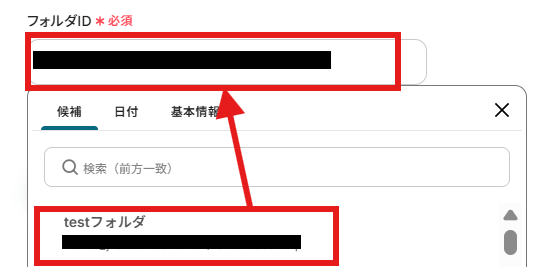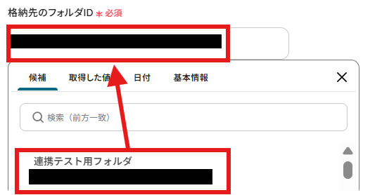 「格納先のフォルダID」はステップ3で選んだフォルダとは別のフォルダを候補から指定してください。