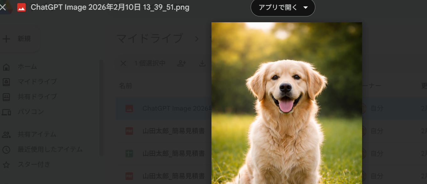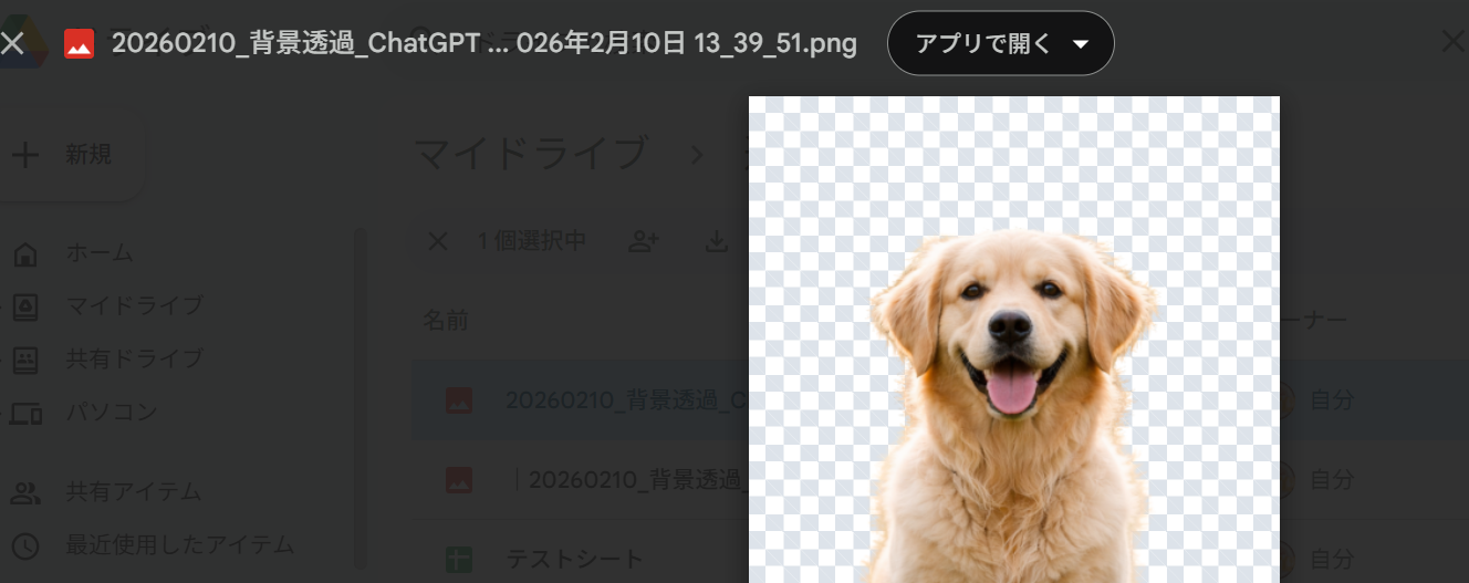 保存先に指定したGoogle Driveのフォルダも見に行き、背景透過された画像が保存されていればOKです。