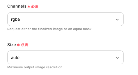 「Channels」「Size」はデフォルト値で入力されている「rgba」「auto」のままにしています。