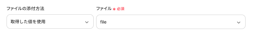 「ファイルの添付方法」、「ファイル」もデフォルト値のまま、以下のように設定しています。