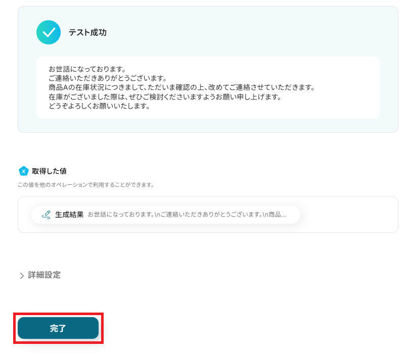 テストに成功すると、返信文が出力されます。 内容を確認し「完了」を押してください。