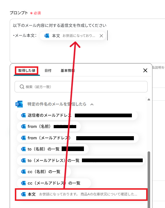 「プロンプト」では、AIへの指示内容を自由に入力できます。 取得した値を引用することで、トリガーが実行されるたびに最新の値が反映されます。 また、入力欄にはデフォルトで指示文の例が入っていますが、そのまま利用しても、必要に応じて任意の指示に変更しても問題ありません。