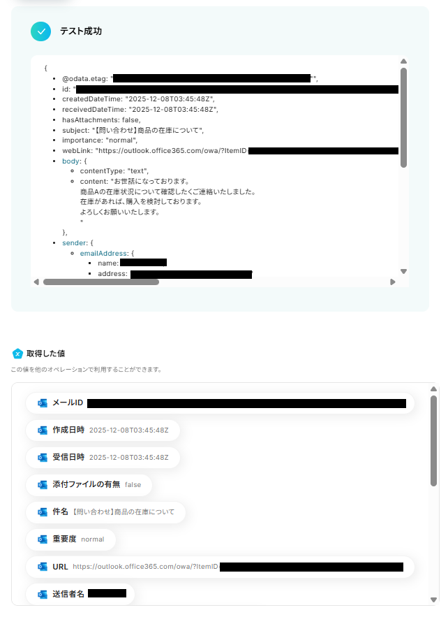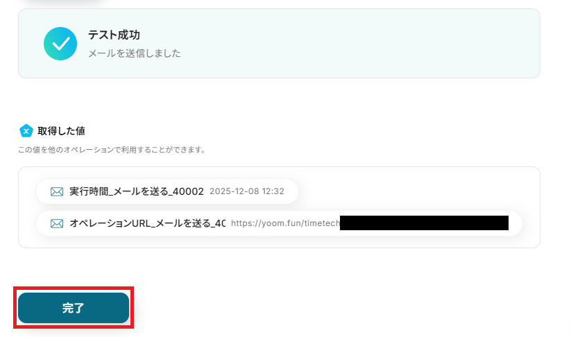 テストが成功すると、下記のような取得した値が表示されます。 取得した値はこのあとの設定でも使用します。 メールの内容が反映していればOKです。 「完了」を押して次に進みましょう!