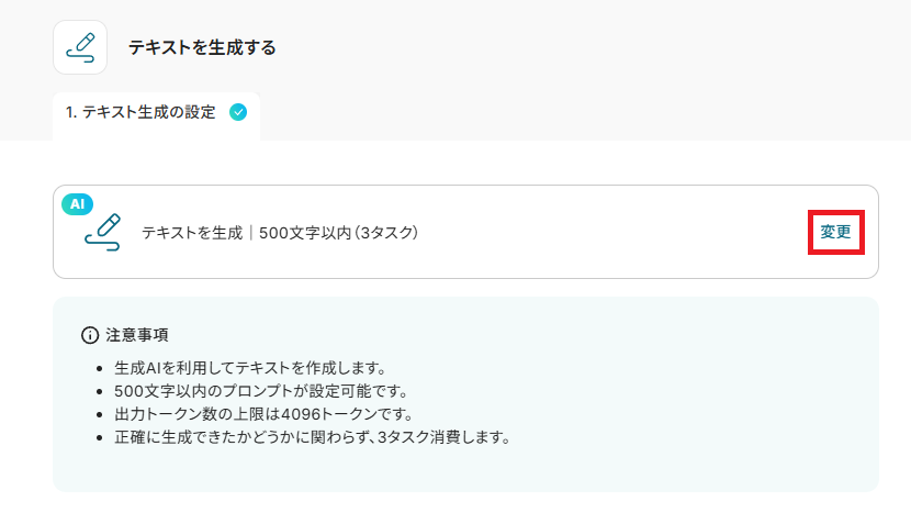 デフォルトで「テキストを生成|500文字以内(3タスク)」 が、設定されています。 指示可能なプロンプトの文字数によって消費タスク数が変動するので、変更したい場合は「変更」から選択可能です。